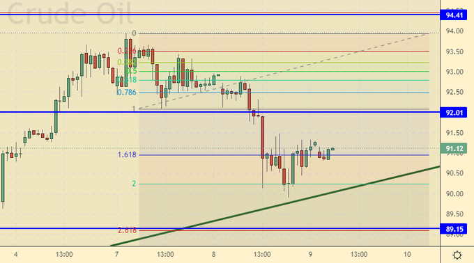 API сообщил о падении запасов нефти в США за неделю на 2.025 млн. баррелей. Этого оказалось недостаточно для того, чтобы рынок отказался от своих намерений скорректироваться. Внизу у нас остается нетронутой цель на 89.15. Если она действительно будет достигнута, то рынок может в перспективе достичь уровня 84.00 и, возможно, 80.00.