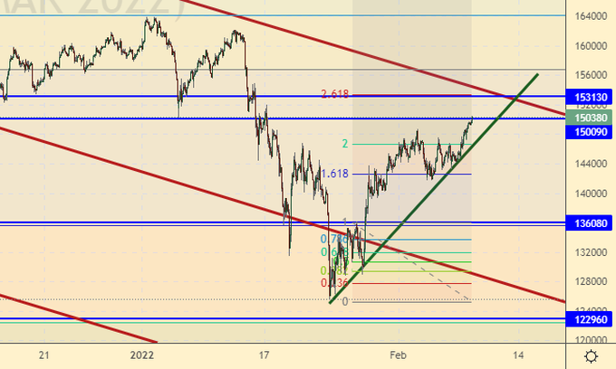 Рынок демонстрирует оптимизм на фоне укрепления курса рубля и намеков на снижение напряженности в Европе. Пока мы находимся под 160000 говорить о развороте вверх не будем.