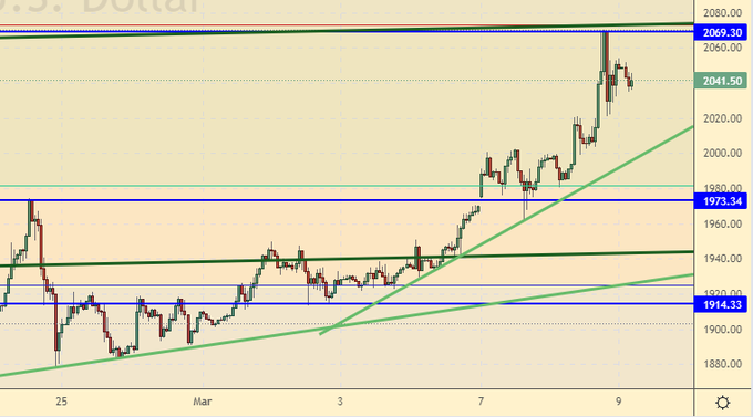 Достигли очередного уровня сопротивления, мы уже выше 2000. Вряд ли сейчас нам стоит рассчитывать на полноценную коррекцию. Небольшой ход вниз к 2000.0 возможен, после чего продолжится восходящее движение. К доллару очень много вопросов. Даже если ФРС поднимет ставку 16-го числа, нам не стоит ждать, что золото уйдет ниже 1950.