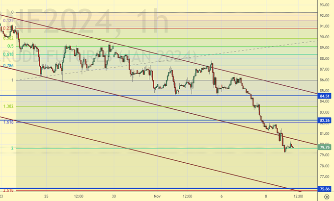 Вполне себе неплохое давление на доллар. Пока можно рассчитывать на падение к 87.50. О более низких уровнях не говорим. Пусть у нас где-то в теории есть перспектива завершения конфликта на Украине, пусть даже в 25-м году или раньше, но перспектив снятия санкций у нас нет.