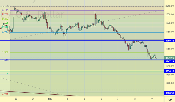 Видим новый минимум, продолжаем уходить вниз. Скорее всего мы достигнем уровня 1908, что даст нам повод войти в покупку. При этом, вероятность продолжения восходящего движения снизится. Для быков было бы лучше если бы мы остановились на текущих отметках, или не прошли ниже 1930.