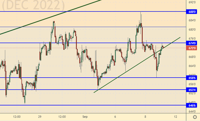 Шансы на падение на рынке кукурузы в понедельник невелики, но они есть. Если мы увидим, что объемы урожая не пострадали в результате неких засух, ветров, суховеев, волн жары и остальных напастей, которые с великим удовольствием тиражировали журналисты, то нас может ждать снижение в район 650.0. О более сильном падении пока не рассуждаем. Быки явно хотят задрать цены на рынке продовольствия до небес.