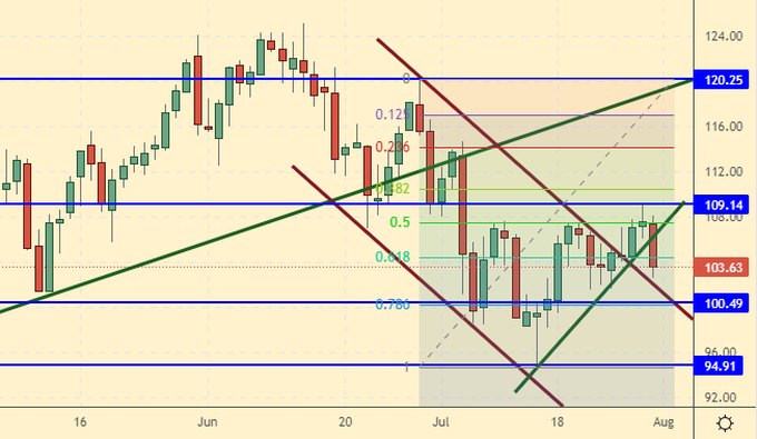 Сценарий роста: рассматриваем августовский фьючерс, дата экспирации 31 августа. Быки не смогли закрепиться выше уровня 108.00 долларов за баррель. Не покупаем.
