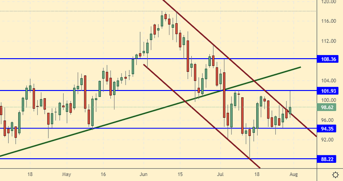 Сценарий роста: рассматриваем сентябрьский фьючерс, дата экспирации 22 августа. Быки не смогли закрепиться выше уровня 100.00 долларов за баррель. Эта неудача может привести к тому, что рынок развернется вниз. Новых позиций не открываем.