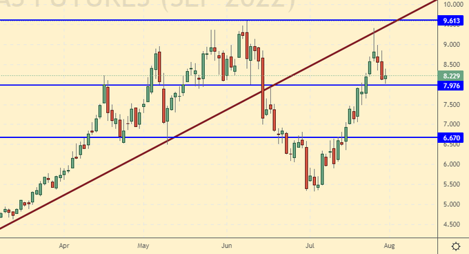 Сценарий роста: рассматриваем сентябрьский фьючерс, дата экспирации 29 августа. Будем держать лонги. Ситуация с поставками газа в Европу становится острее день ото дня, что держит в напряжении и глобальный рынок.