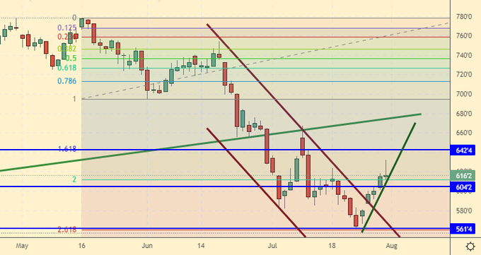Покупка: нет. Кто в позиции от 580.0, перенесите стоп на 590.0. Цель: 640.0 центов за бушель.