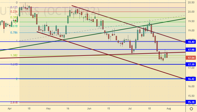 Сценарий роста: рассматриваем октябрьский фьючерс, дата экспирации 30 сентября. Продолжаем оставаться вне рынка. Готовим деньги для покупок от 16.40 и 15.20 центов за фунт.