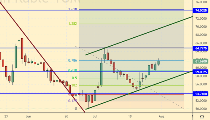 Сценарий падения: если рынок не поднимется выше 62.00, то это может стать сильной предпосылкой еще для одного раунда укрепления рубля. Здесь можно продавать. Стоп-ордер ставим близко.