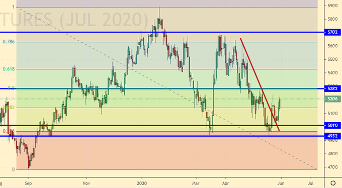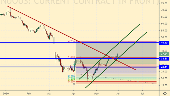 В конце следующей недели ждем техническое заседание ОПЕК+. Не исключено, что 9 и 10 июня пройдет очередная встреча министров энергетики. Представители КСА настаивают на продлении жесткого режима сокращения добычи. Позиция России – ждать, так как есть определенная надежда на рост спроса из-за возобновление пассажирского авиасообщения через один два месяца.