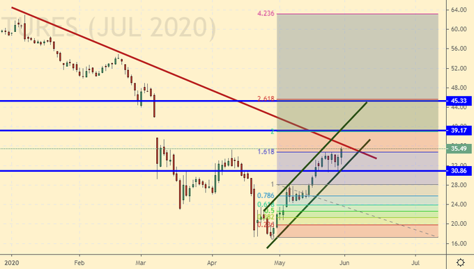 Продажа: думать при подходе к 40.00. От 45.00 продавать обязательно. Стоп: 47.30. Цель: 31.60.