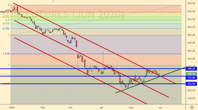 Сценарий роста: рассматриваем июньский фьючерс, дата экспирации 11 июня. Закрепились выше недавней линии сопротивления. Пока мы выше 270.0 можно покупать. Рост к 400.0 возможен.