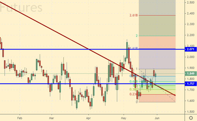 Сценарий роста: рассматриваем июльский фьючерс с датой экспирации 26 июня. Быки пытаются сформировать начало третьей волны импульса вверх, которая может привести к ходу в район 2.40. Здесь можно покупать.