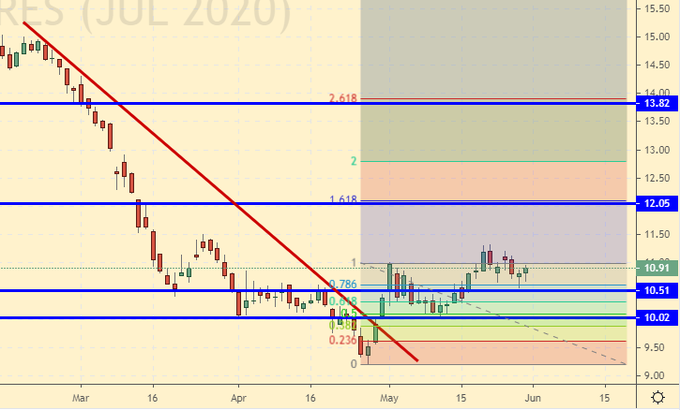 Сценарий роста: рассматриваем июльский фьючерс, дата экспирации 30 июня. Продолжим, как и неделей ранее, двигать стоп-ордера по тренду. Шансы на достижение 12.00 сохраняются. Более сильный рост остается под вопросом.
