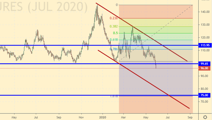 Сценарий роста: рассматриваем июльский фьючерс, дата экспирации 21 июля. Ушли ниже 100.0. Видим, что цель нисходящего движения находится на 75.00. При подходе к данной отметке – покупать.