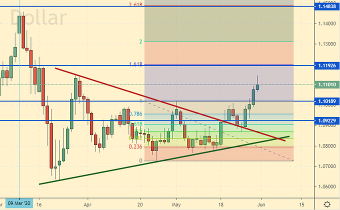 Сценарий роста: в районе 1.1200 часть медведей будет встречать рынок. Однако, так как статистические данные по США выходят крайне негативные: общее число лиц, получающих пособия 20.052 млн., первичные заявки на пособие по безработице за неделю +2.12 млн., мы можем предположить продолжение ослаблений позиций доллара. В следующую пятницу рынок может уйти выше 1.1200, так как в первую пятницу июня нас ждет изменение числа занятых в частном несельскохозяйственном секторе за май. Хорошо если увидим падение на 8 млн. человек, и это с учетом того, что минус 19.52 млн. было в апреле.