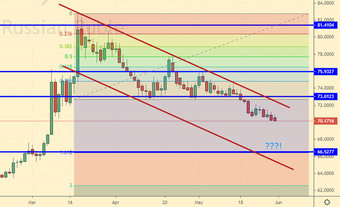 До 4-го июня будет продолжаться продажа долларов в рамках бюджетного правила в объеме 163 млн. долларов в день, что не будет давать рынку развернуться вверх на следующей неделе.