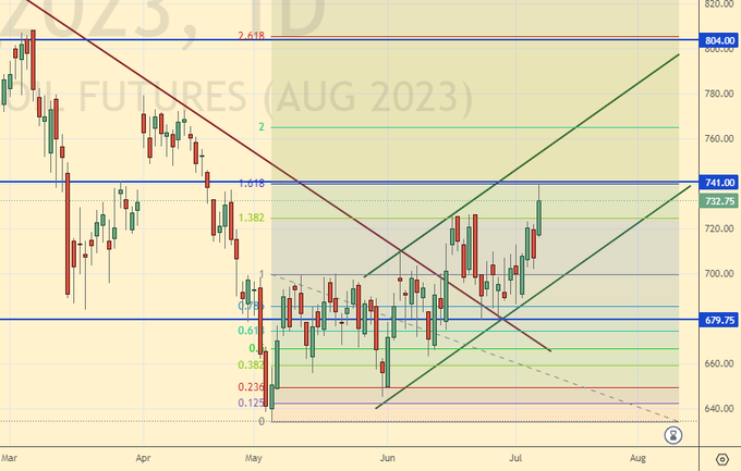 Сценарий роста: перешли на августовский фьючерс, дата экспирации 10 августа. Покупки прошлой недели оказались удачными. Держим позиции. Если дойдем до 800.0, то и хорошо.