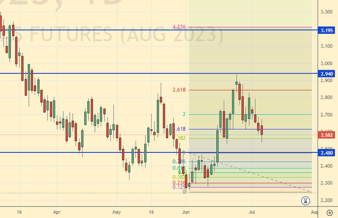 Сценарий роста: рассматриваем сентябрьский фьючерс, дата экспирации 14 сентября. Надо подержать лонг. Возможно, что после отчета USDA рынок вырастет.