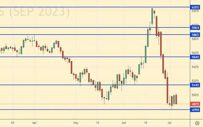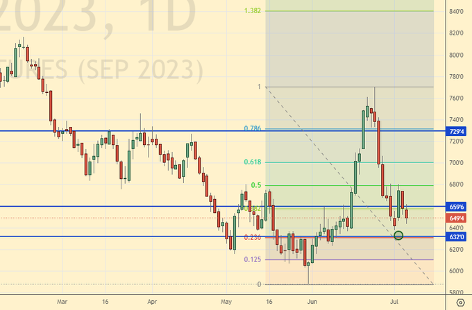 Опять начались разговоры о том, что «зерновую сделку» надо продлевать, напомним, текущее соглашение действует до 18-го числа сего месяца. Если это произойдет, то рынок будет способен осуществить сброс котировок к 550.0 по пшенице и 450.0 по кукурузе. Более сильное падение пока не просматривается. В здоровой ситуации мы должны были бы наоборот вырасти до 850.0 и 700.0 соответственно, после чего можно было бы говорить о начале падения к указанным выше минимумам.