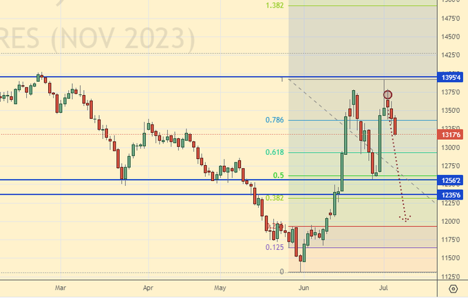 Сценарий роста: рассматриваем июльский фьючерс, дата экспирации 31 июля. Подошли к верхней границе диапазона. Пока вне рынка.