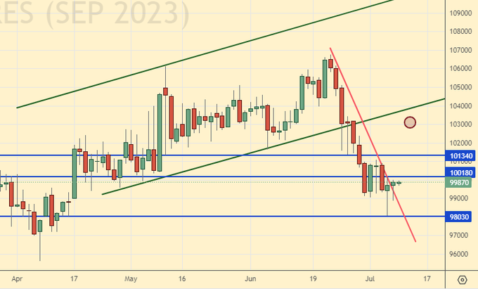 Сценарий роста: рассматриваем сентябрьский фьючерс, дата экспирации 15 сентября. Максимум на что способен рынок – это подняться к 103000. Но это не та перспектива, на которую надо реагировать. Вне рынка.