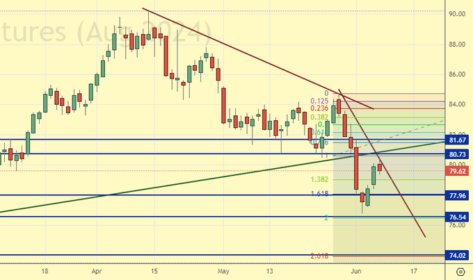 Сценарий роста: рассматриваем июльский фьючерс, дата экспирации 20 июня. Теперь покупки имеют смысл после роста выше 80.00.