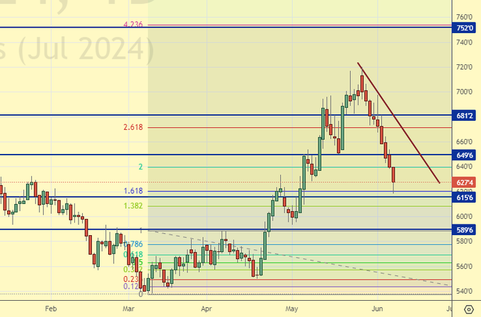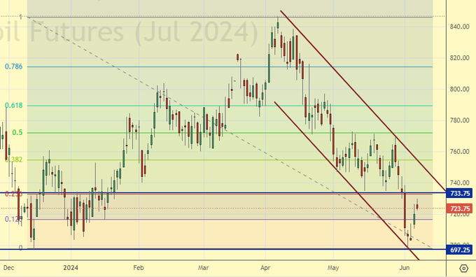 Пшеница упала на фоне докладов об отличном урожае в Индии, что означает снижение закупок данной страной пшеницы на внешнем рынке. На следующей неделе ждем прогноз от американского Минсельхоза, который скорее всего будет не менее оптимистичным чем майский, что приведет или к падению цен, или к тому, что они останутся на текущих уровнях. В теории, возможен краткосрочный ценовой всплеск по пшенице до 750 центов за бушель. Предположить сейчас еще более высокие цены в Чикаго невозможно.