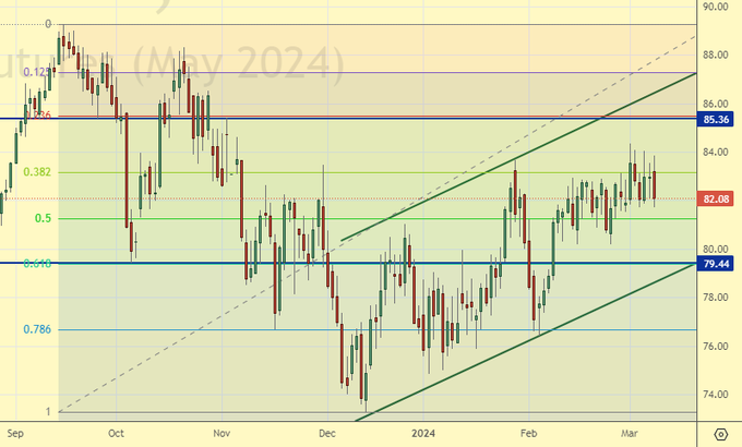 Как мы видим, причем без лупы, рынок не желает реагировать на обстрелы кораблей в Красном море, на сокращение добычи нефти ОПЕК, и даже на рост отпускных цен для Азии со стороны КСА. Да, мы выше 80.00 по Brent, но при этом попытки быков раскачать рынок пока безуспешны.
