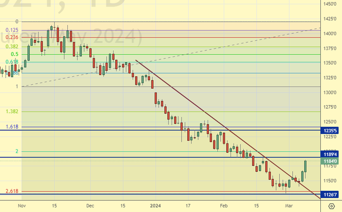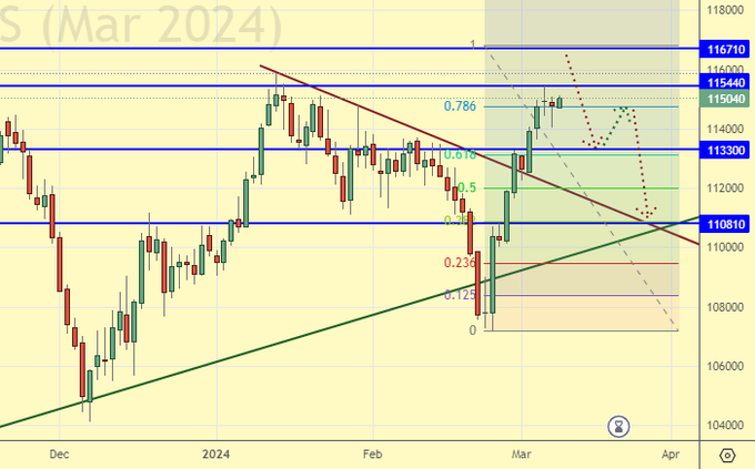 Сценарий роста: рассматриваем мартовский фьючерс, дата экспирации 21 марта. А мы закрылись выше 115000… кто бы мог подумать. Это открывает путь на 116700. Только выше рынок не виден. Не покупаем. Только если доллар начнет тотальное падение ко всем валютам можно будет рассуждать о каких-то иных отметках, например, о 120000.