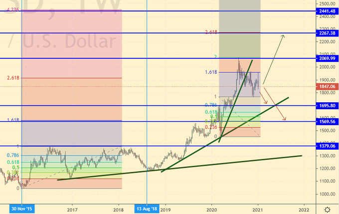 Сценарий роста: откаты к 1700 и 1600 можно использовать для покупок, но только при условии, что фьючерсы процентную ставку в США будут оставаться около нуля.