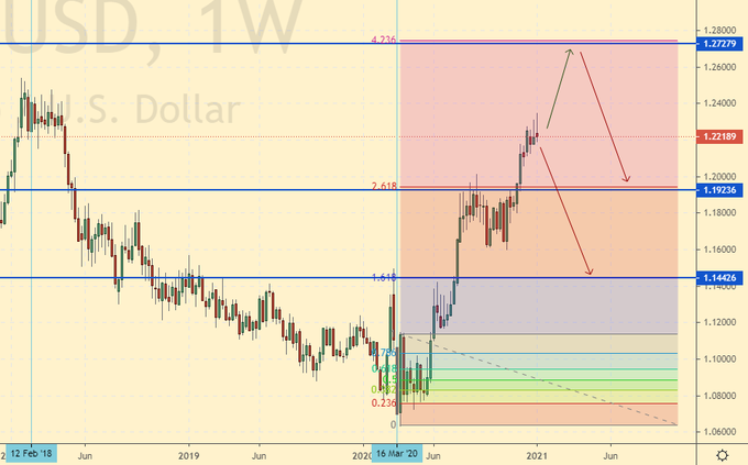 Сценарий падения: Байдена утвердили, рынок золота просел. Дальнейшее развитие событий будет зависеть от того, что демократы будут творить, получив власть. Шорт от 2260 смотрится естественно. Продажи с текущих уровней возможны, но шансы на успех не велики.