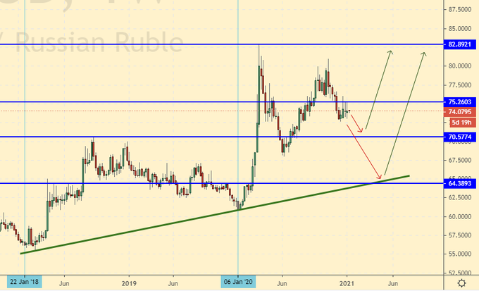 Пока Запад будет восстанавливаться после пандемии, вакцинироваться и считать убытки, у рубля есть шанс сходить в район 65.00. Дальнейшее укрепление пока не просматривается.