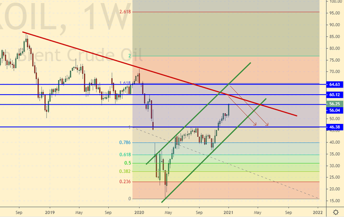 Сценарий роста: нефть способна пройти к 60.00. Рост к 65.00 маловероятен. После позитивной реакции на утверждение Байдена президентом США, на рынке назрела коррекция.