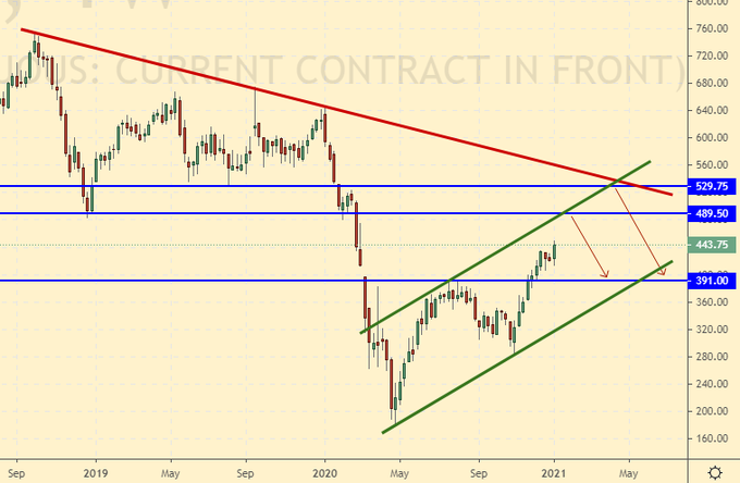 Сценарий роста: видим, что рынок очень хочет дойти до 500.0. Рост к 530.0 также возможен. Для покупок нам нужен откат в район 400.0.