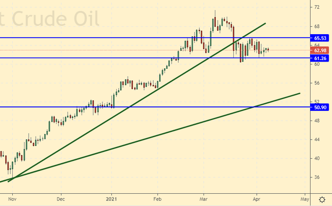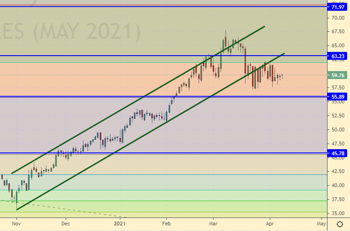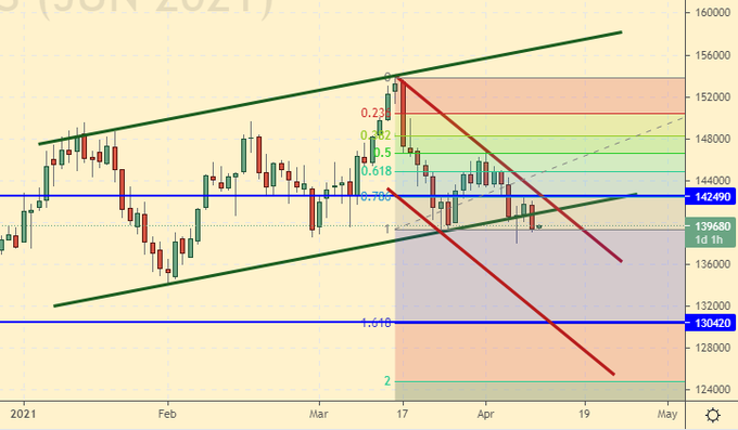 Сценарий роста: рассматриваем майский фьючерс, дата экспирации 20 апреля. Риск прохода к 46.00 сохраняется. Держим паузу. Признаём, что в случае роста выше 65.00 будем пересматривать свои подходы.