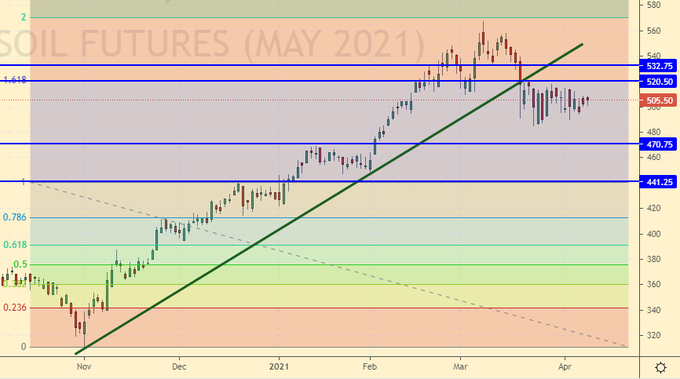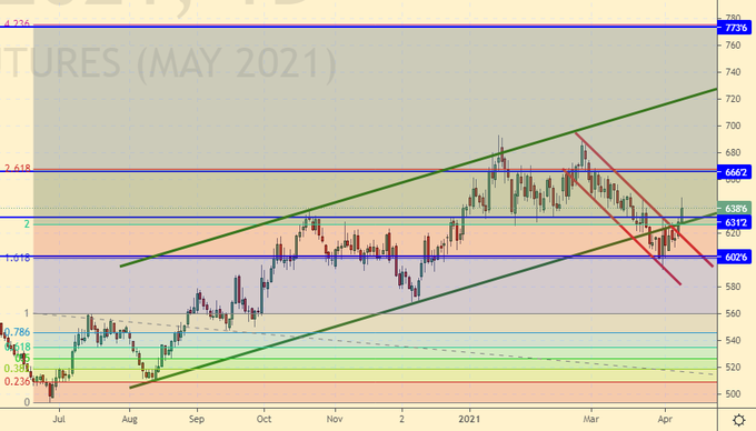 Сценарий роста: рассматриваем майский фьючерс, дата экспирации 14 мая. Покупать будем после роста выше 1470.0. Есть шанс, что соя пройдет к 1720.0.