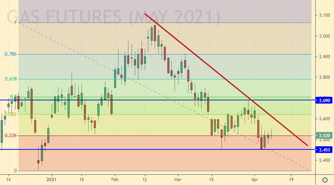 Сценарий роста: рассматриваем майский фьючерс, дата экспирации 28 апреля. Газ нас расстраивает. Расти не хочет. А мы всё равно будем покупать, так как ниже у нас только «ноль». Правда, и тот иногда не предел.