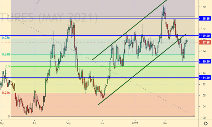 Сценарий роста: рассматриваем майский фьючерс, дата экспирации 18 мая. Лонг не очевиден. Только возврат выше 135.00 заставит нас покупать.