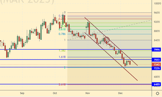Продажа: нет. Кто в позиции от 670.0, перенесите стоп на 663.0. Цель: 580.0 центов за бушель. На уровне 630.0 можно закрыть 25% позиции.