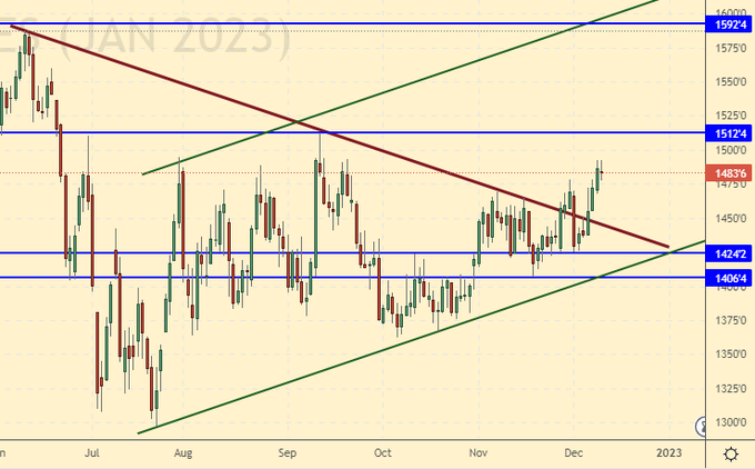 Вышли очередные данные по валовому сбору зерновых и масличных от USDA. Изменения в оценках по сравнению с ноябрем незначительные, так пшеницы планируется взять в сезоне 22/23 780.5 млн. тонн, кукурузы – 1168.8 млн. тонн, сои – 391.2 млн. тонн. Показатели хорошие. Тем, у кого есть немного денег голод не грозит. Малоимущим подадут. Господин Патрушев пообещал поставить 500 тысяч тонн российского зерна на безвозмездной основе бедным странам.