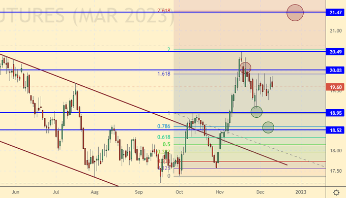 Продажа: нет. Кто в позиции от 20.00 и 19.50, держите стоп на 20.10. Цель: 18.00 центов за фунт.