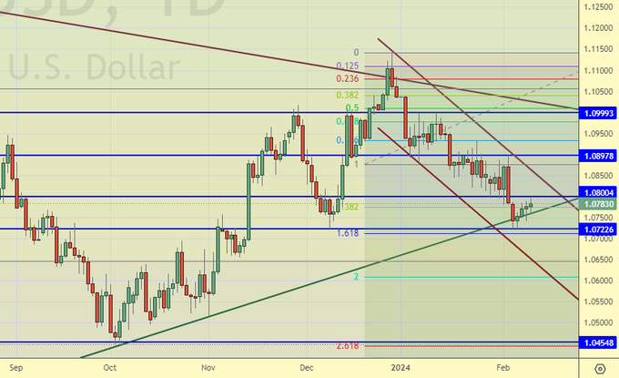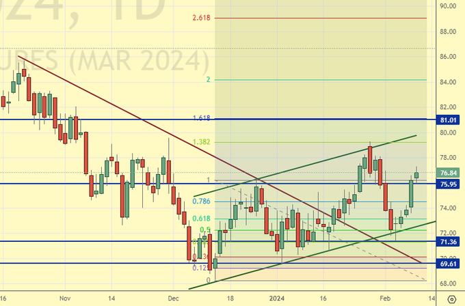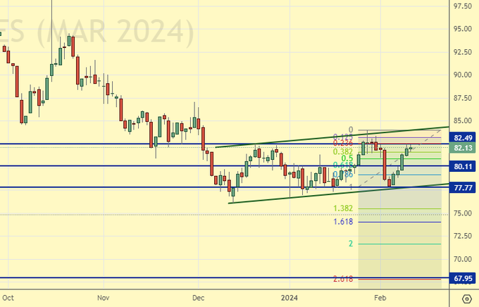Сценарий роста: перешли на февральский фьючерс, дата экспирации 29 февраля. Рост выше 85.00 станет сюрпризом. Пока он не произошел, вверх не смотрим.