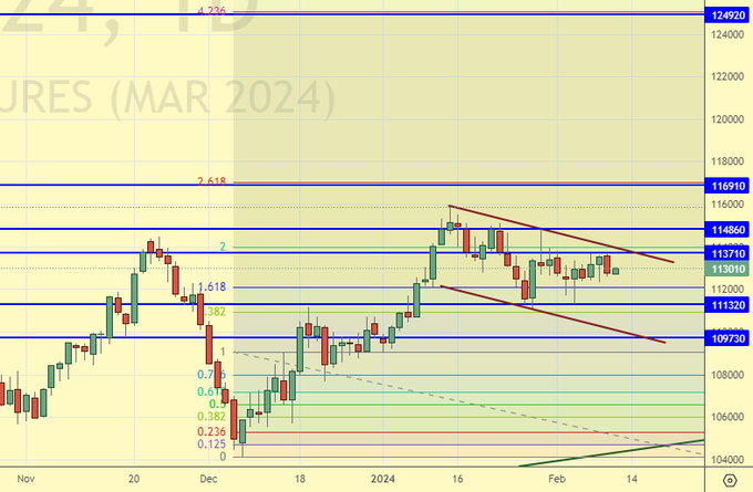 Сценарий роста: рассматриваем мартовский фьючерс, дата экспирации 21 марта. За неделю ничего не произошло, поэтому оставляем наши рассуждения без изменений. Рост к 125000? Да, есть небольшие шансы, но лучше бы нам вырасти выше 115000. Тогда в рост поверит большое число быков.