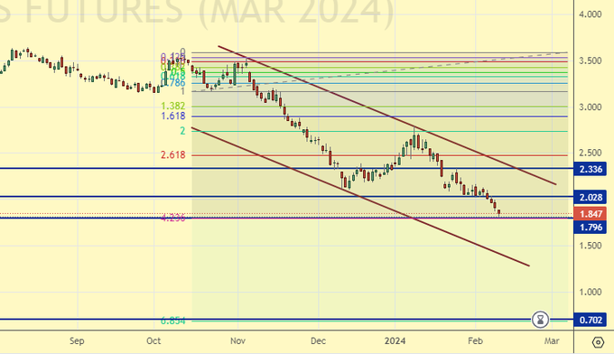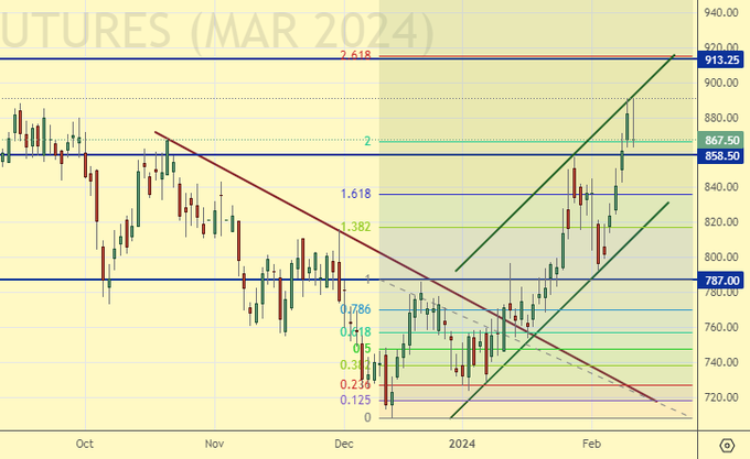 Кукуруза продолжает падать и наша цель на 420.0 центов за бушель всё ближе. Мы не исключаем и более глубокого погружения на 390.0, а вот еще ниже цены уже вряд ли упадут, иначе фермеры не сведут концы с концами, не одно хозяйство, а весь сельхоз сектор в глобальном масштабе.