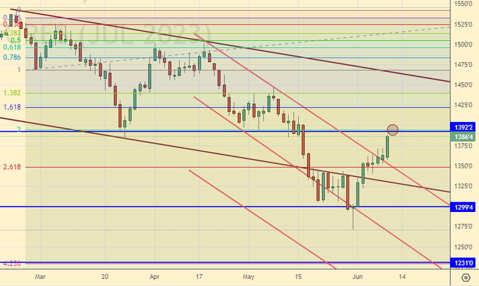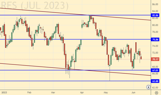Сценарий роста: рассматриваем июльский фьючерс, дата экспирации 28 июня. Пока не можем разогнаться вверх. Держим лонги, новые позиции не открываем.