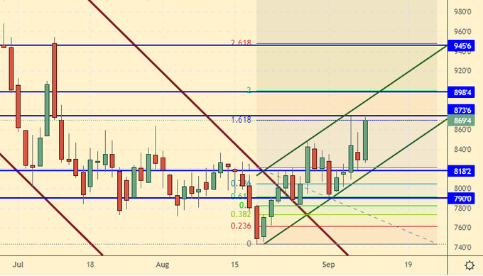 Сценарий роста: рассматриваем сентябрьский фьючерс, дата экспирации 30 сентября. Продолжим отказываться от покупок. Для хорошего входа в лонг нужно падение к 85.00.
