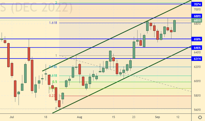 Продажа: нет. Кто в позиции от 680.0 держите стоп на 690.0. Цель: 580.0 центов за бушель.
