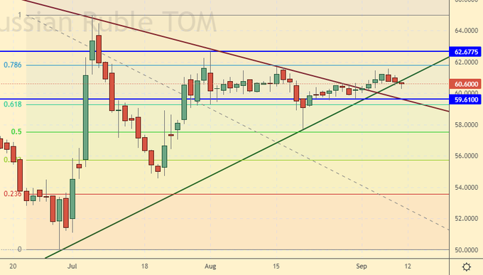 Покупка: в случае роста выше 62.00. Стоп: 60.00. Цель: 74.00 рубля за доллар.