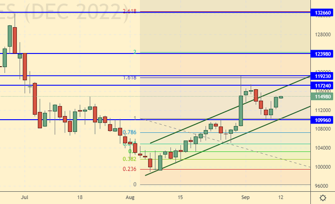 Сценарий роста: рассматриваем декабрьский фьючерс, дата экспирации 15 декабря. Желающие могли купить при откате к 110000. Теперь стоит удерживать лонги с целью на 132000. Рост выглядит совсем необязательным в текущих условиях, но мы вынуждены учитывать настроения толпы. А народ смотрит вверх.