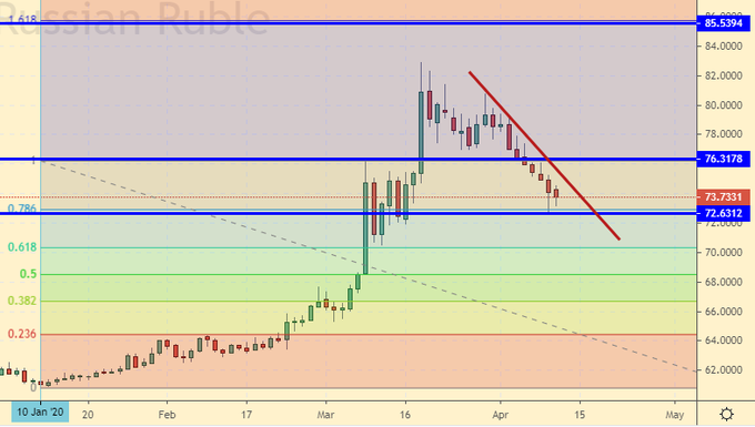 Сценарий роста: видим, что сход (шабаш) нефтяников порадовал рубль, но не сильно. Мы достигли 73.00 и на этом всё закончилось. В текущей ситуации, пусть не в апреле, пусть в мае, если людям просто не раздадут денег, Россию могут ждать сильные потрясения. Кредитная схема развития экономики имеет один недостаток – человеку для выполнения своих обязательств постоянно нужна работа. Покупаем доллары после возврата рынка выше 74.00.